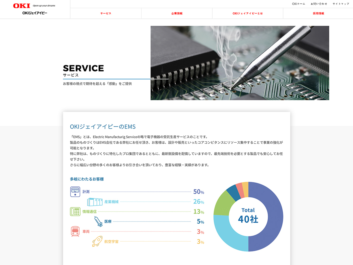 OKI JPI様のサイトリニューアルのデザインとコーディングを担当しました。打ち合わせから撮影や取材同行など、顧客折衝なども含めた進行管理も行いました。