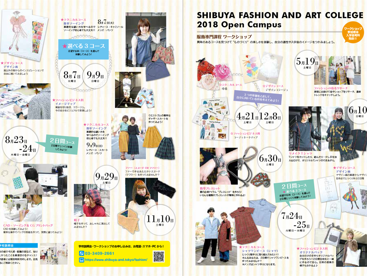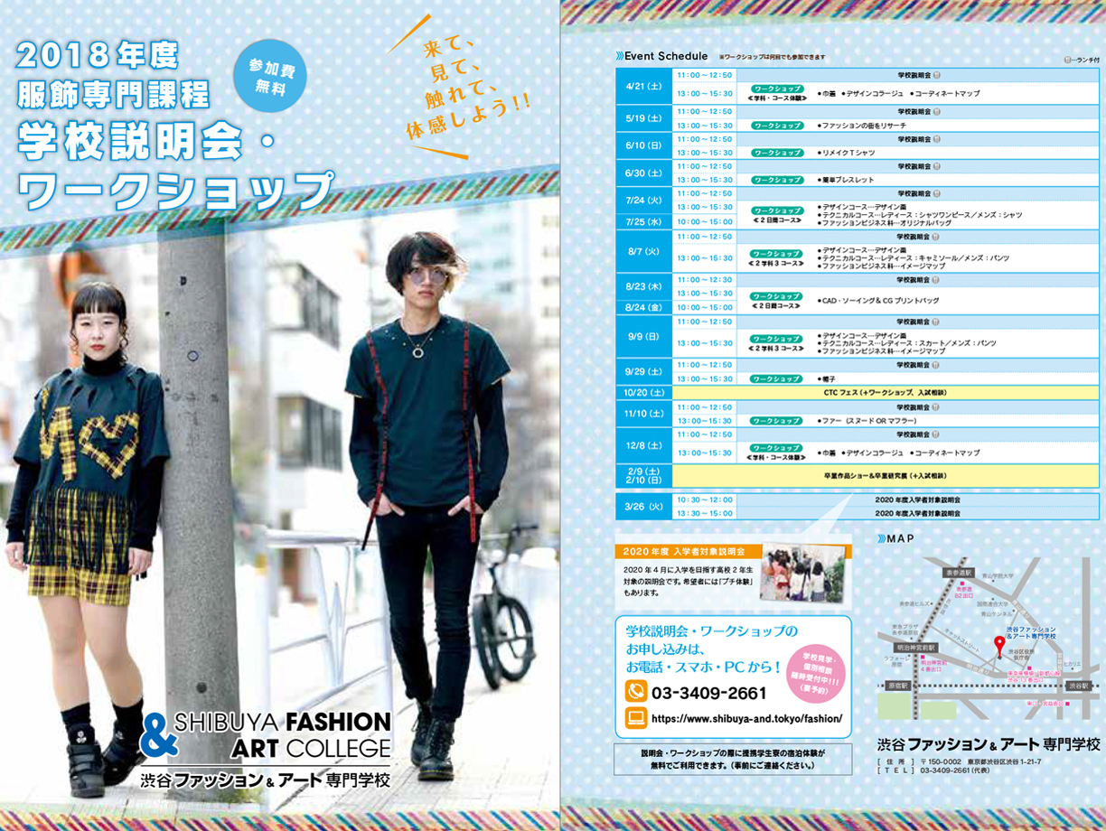 渋谷ファッション&アート専門学校の服飾専門課程の学校説明会&ワークショップの案内リーフレットのデザインを担当しました。